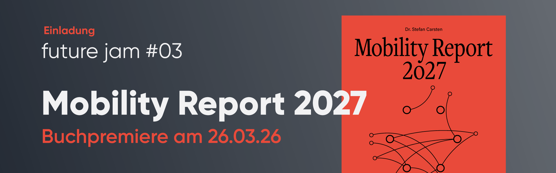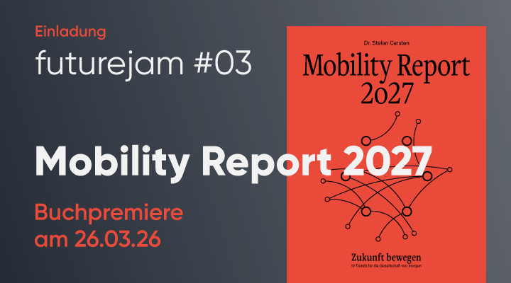 Antworten und ganz bestimmt reichlich Diskussionsstoff liefert der druckfrische „Mobility Report 2027 – 10 Trends für die Gesellschaft von morgen“, dessen Erscheinen wir zusammen mit Zukunftsforscher Dr. Stefan Carsten und Ihnen am Donnerstag, den 26. März feiern wollen. Seit seiner ersten Ausgabe hat der Mobility Report einen festen Platz in unserer Strategie-Bibliothek. Umso stolzer sind wir, die Buchpremiere nun erstmals nach Kiel zu holen.