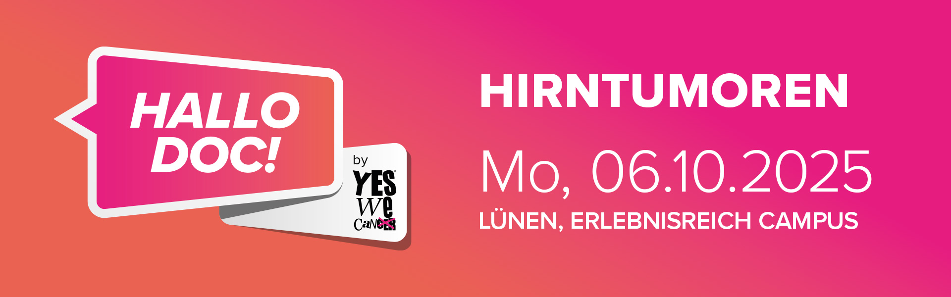 Wir laden dich herzlich zum HALLO DOC! Hirntumoren am 6. Oktober 2025 in Lünen (NRW) ein, 17:30-20 Uhr im Erlebnisreich Campus (Raum: Kantine).
