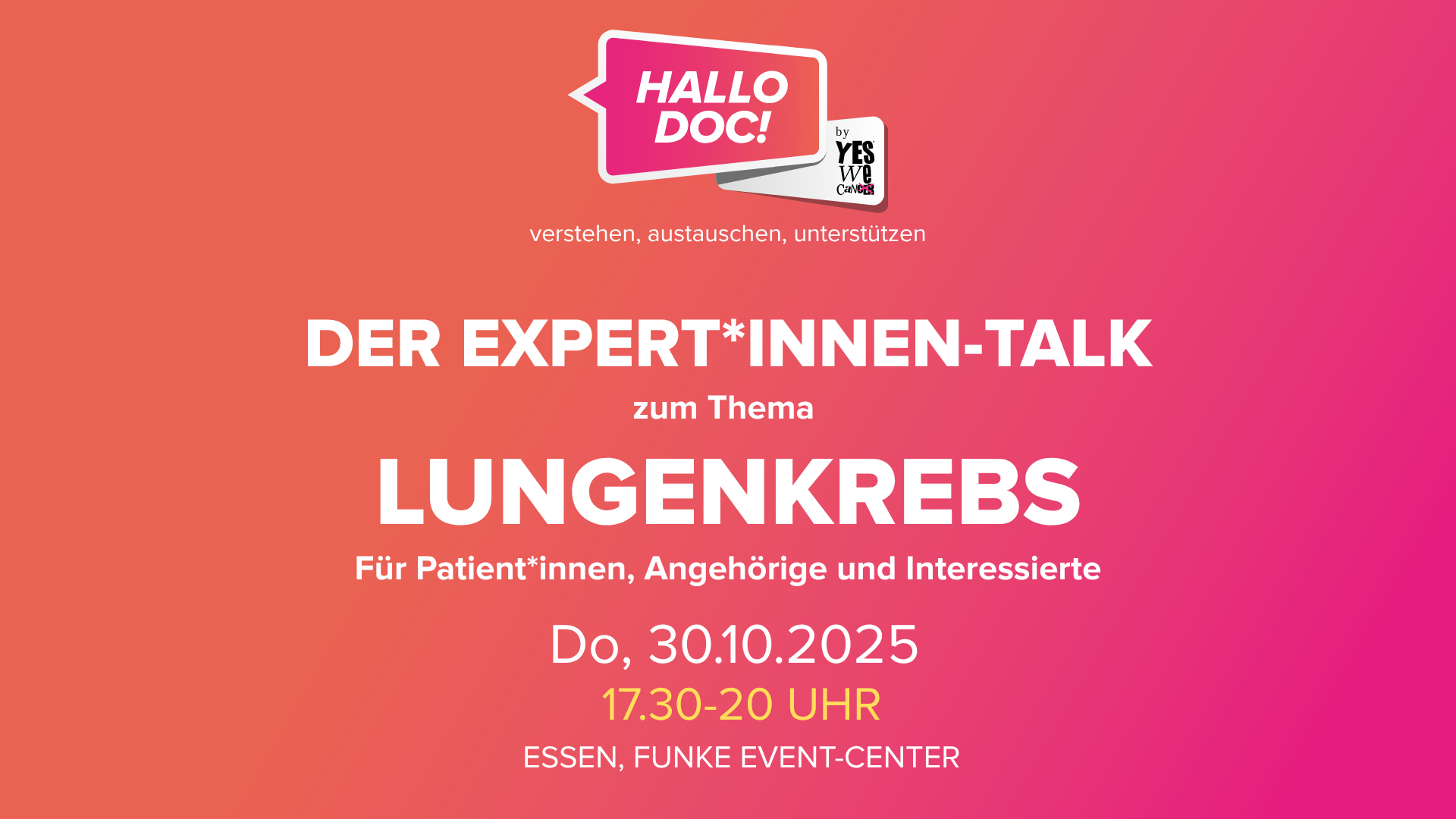 Wir laden dich herzlich zum HALLO DOC! Lungenkrebs am 30. Oktober 2025 in Essen (NRW) ein, 17:30-20 Uhr im FUNKE Eventcenter (Raum: FUNKE Lounge), Jakob-Funke-Platz 1, 45127 Essen.