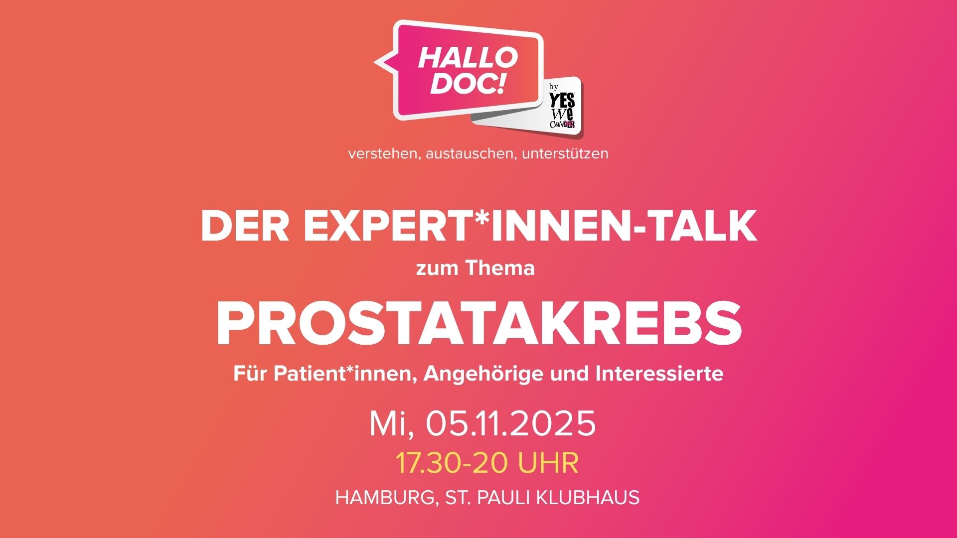 Wir laden dich herzlich zum HALLO DOC! Prostatakrebs am 05. November 2025 in Hamburg ein, 17:30-20 Uhr im St. Pauli Spirit Klubhaus by Pauli Spirit (3. Etage).