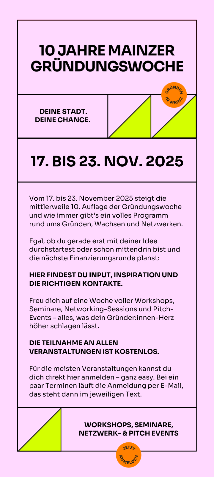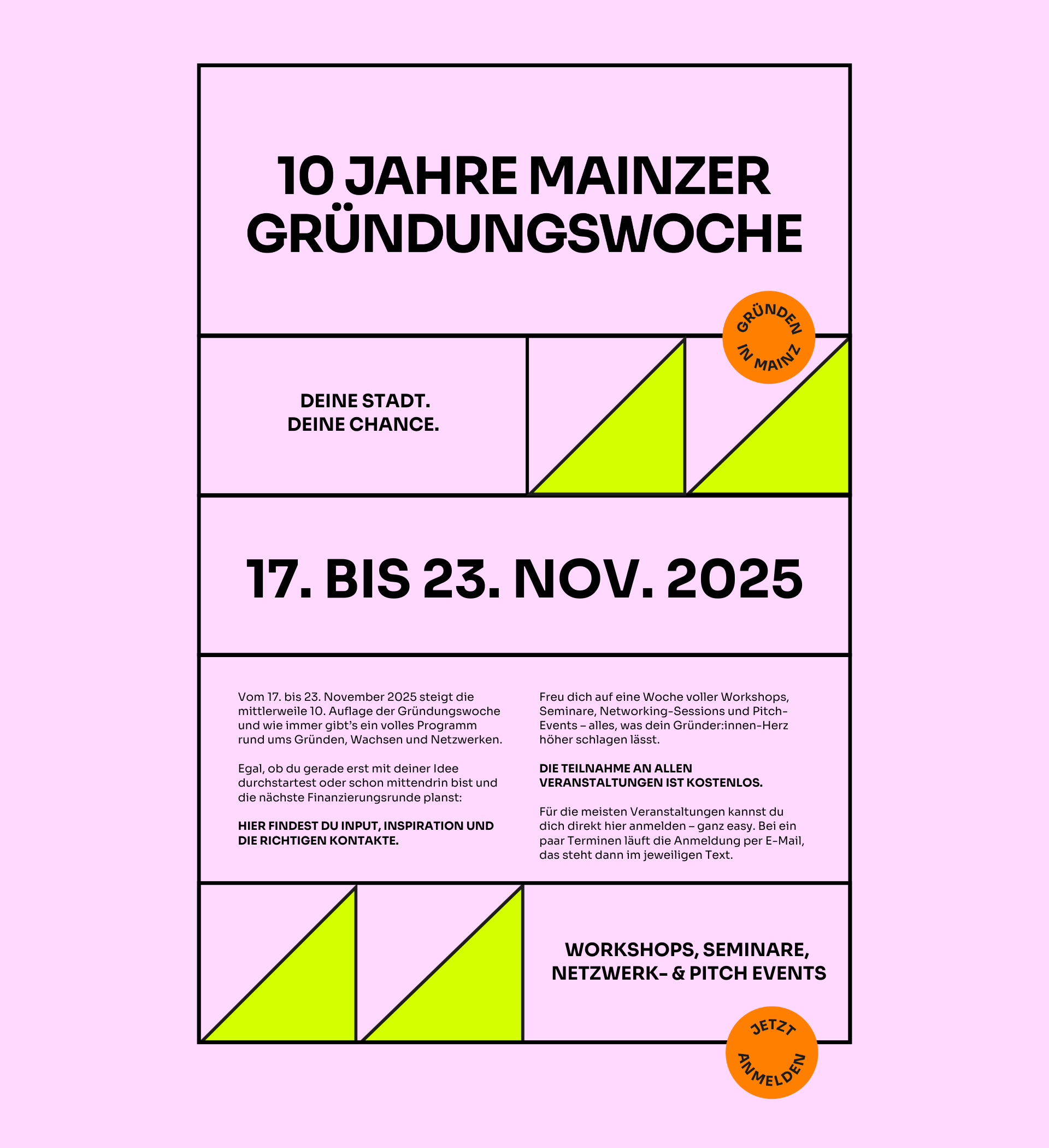 Erlebe hautnah, wie kreative Ideen entstehen und aus ersten Konzepten echte Gründungsansätze werden. Lerne das Gründerökosystem in Mainz und im Rhein-Main-Gebiet kennen und tausche dich mit inspirierenden Persönlichkeiten aus Wirtschaft, Wissenschaft und Startup-Szene aus.