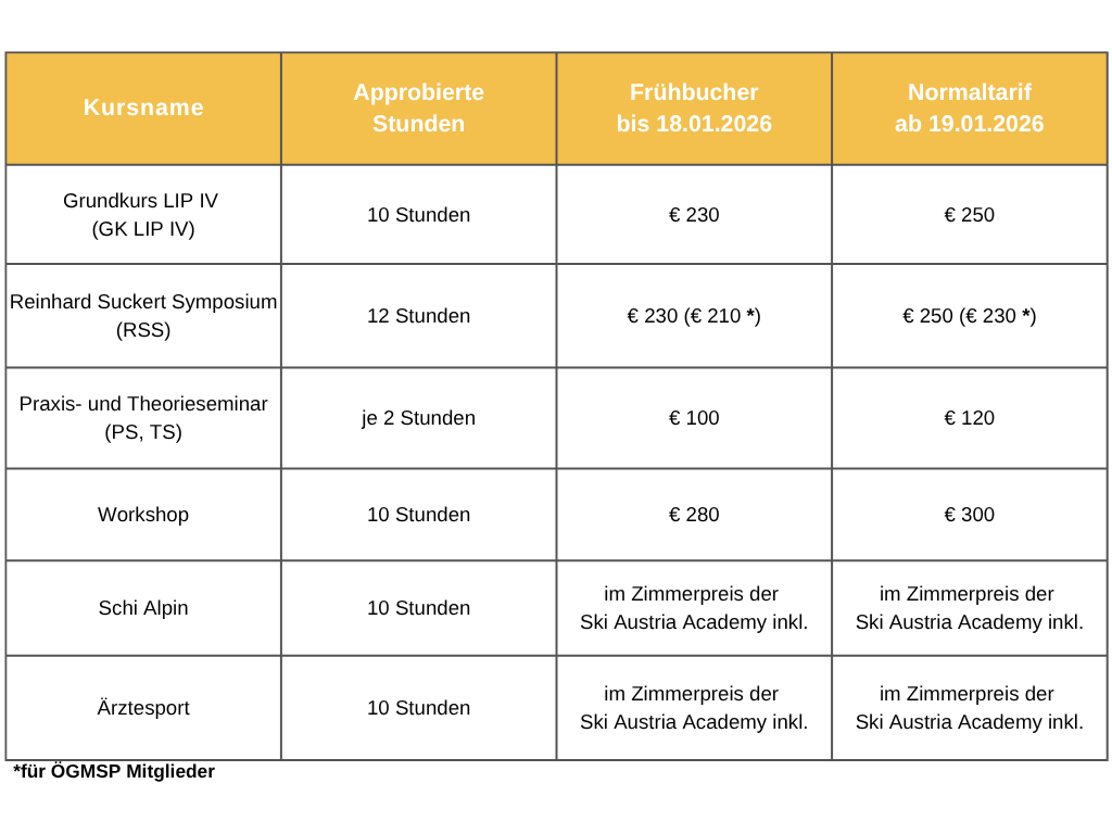 Der Kongress wurde mit insgesamt 37 DFP von der Akademie der Ärzte (www.meindfp.at/dfp-fortbildungssuche) für das ÖÄK-Diplom Sportmedizin akkredidiert. Die vom Veranstalter angesuchten DFP‘s für das ÖÄK-Diplom Sportmedizin werden in voller Höhe nur bei vollständiger Anwesenheit vergeben. Bei mehrmaligem Fehlen erfolgt eine entsprechende Aliquotierung der Stunden. Der Veranstalter weist darauf hin, dass laut Urteil des Verwaltungsgerichtshofes die steuerliche Absetzbarkeit nur dann gegeben ist, wenn mindestens acht Stunden (Grundkurs, Theorie, Praxis) exklusive dem Ärztesport nachgewiesen werden. Wir haben bei der Gestaltung des Programms diesem Umstand Rechnung getragen, um die steuerliche Absetzbarkeit zu ermöglichen.